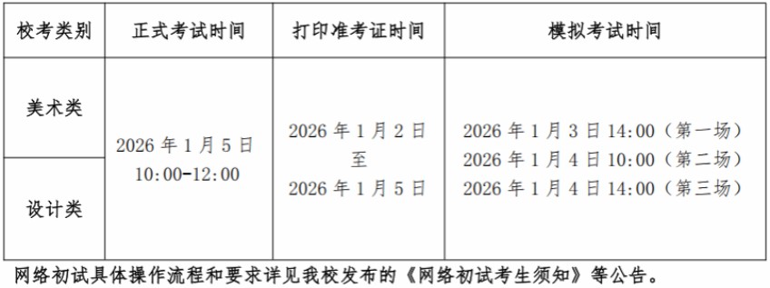 2.校考分网络初试和现场复试两个阶段,初试成绩达到合格要求的考生方可参加复试。初试成绩不计入复试,我校以复试成绩(以下称校考成绩)作为最终校考专业考试成绩和录取依据。