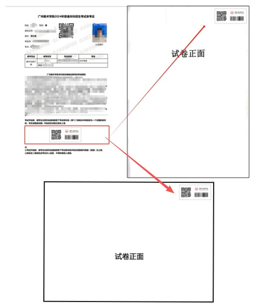 6、把条形码从准考证上完整剪下后粘贴在试卷作答面正面(竖幅或横幅)的右上角或,如下图所示: