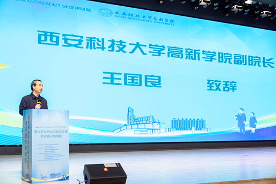 在仪式上,我院副院长王国良代表西安科技大学高新学院全体师生,对市、区人社领导及参训教师表示热烈欢迎。王院长介绍了学院的办学特色与“以就业为导向”的育人理念,强调此次培训对于提升师资能力、促进就业工作的重要意义。他表示,学校将全力做好服务保障工作,并祝愿各位老师在培训中学有所获、学以致用。