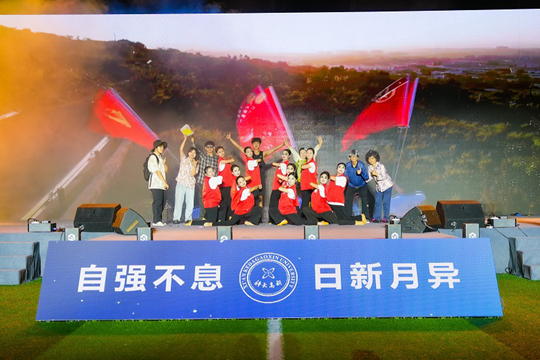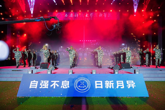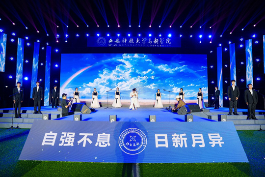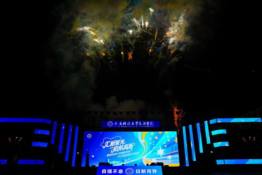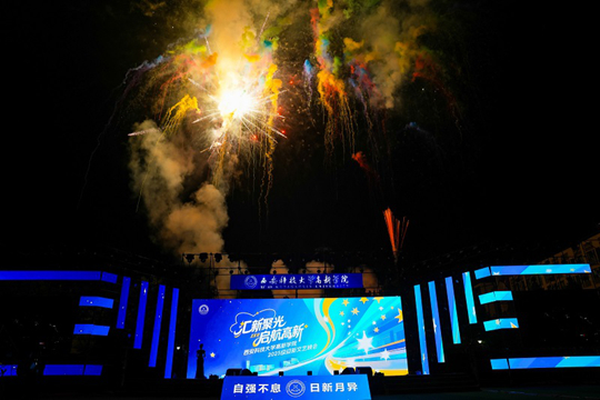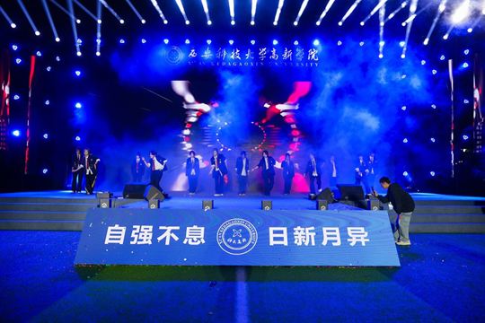 2025年9月24日晚,以“汇新聚光,启航高新”为主题的西安科技大学高新学院2025级迎新文艺晚会在北校区体育场隆重举行。晚会现场星光璀璨、气氛热烈,学院领导手持“高光时刻新想事成”“今天C位出道未来由你定义”等创意手举牌,在缤纷彩屑中为晚会点赞助力;参演人员与身着迷彩服的学生、身着礼服的国旗班成员在“汇新聚光 启航高新”的主题背景前合影留念,尽显校园多元风采。学院领导、各职能部门负责人、教师代表、往年毕业的校友与全体2025级新生欢聚一堂,共同观看了这场青春盛宴。