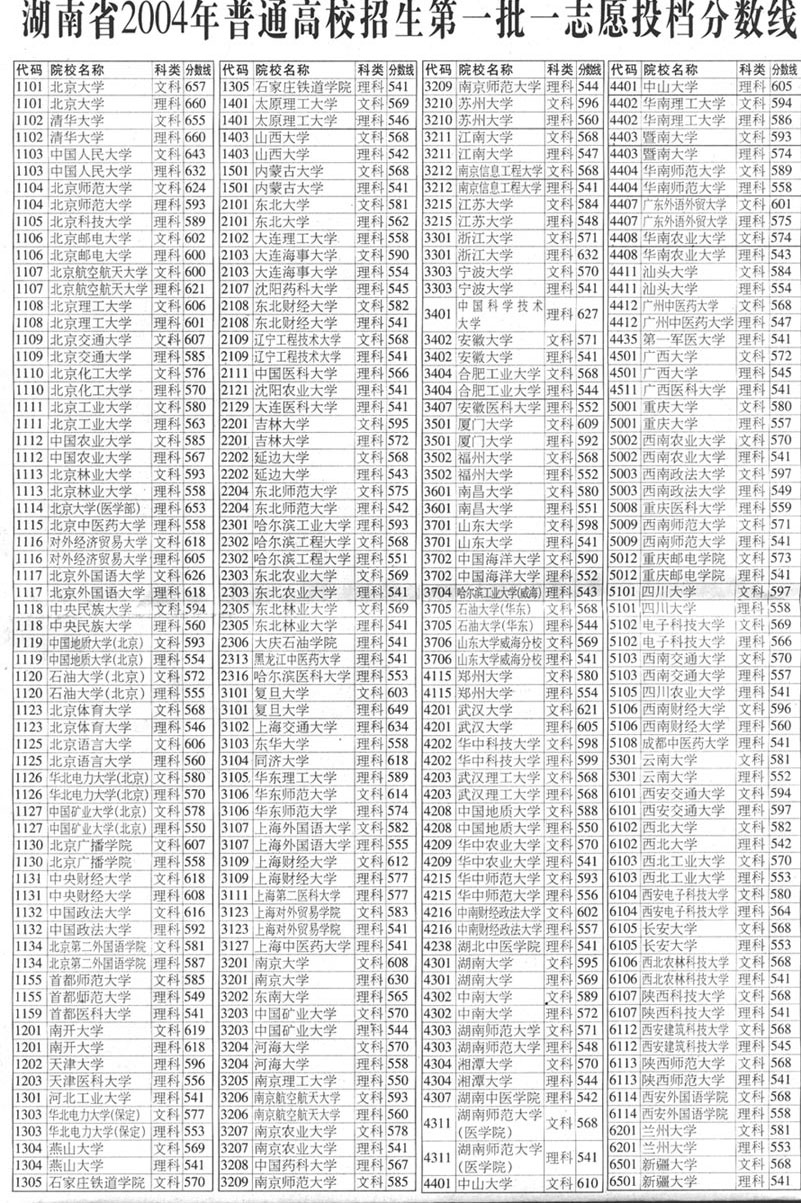 湖南省2004年普通高校招生第一批一志愿投档分数线