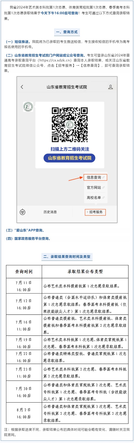 (二)山东省教育招生考试院门户网站或公众号查询。考生可登录山东省2024年普通高考录取查询平台(https://cx.sdzk.cn)查询本人录取结果,或关注山东省教育招生考试院微信公众号,点击【招考服务】→【信息查询】,即可查询录取结果。