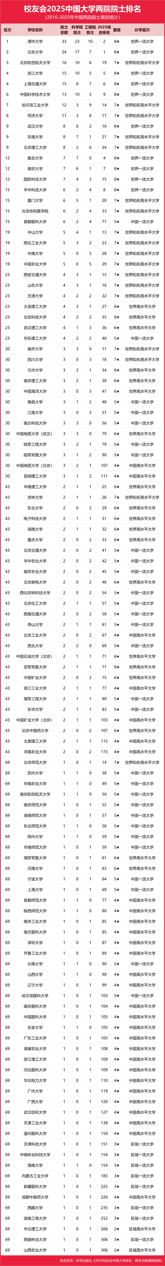 | 校友会2025中国大学两院院士排名,清华大学、北京大学问鼎冠亚军 |