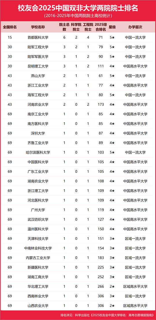 校友会中国大学排名基于“大平台、大团队、大项目、大成果、大校友”体系框架对中国高校办学质量进行系统评价,至今已有23年的历史,已成为具有广泛社会影响力、公信力、参考价值与创新力的中国大学排名领先品牌。校友会2025中国大学两院院士排名统计对象为2016-2025年中国高校申报并当选中国科学院和中国工程院院士的教师。