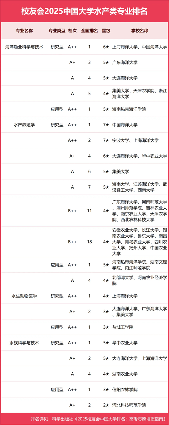 在2025中国大学海洋渔业科学与技术专业排名(研究型)中,中国海洋大学、上海海洋大学荣得2025中国六星级专业(6★),入选世界高水平专业、中国顶尖专业行列,雄居首位。