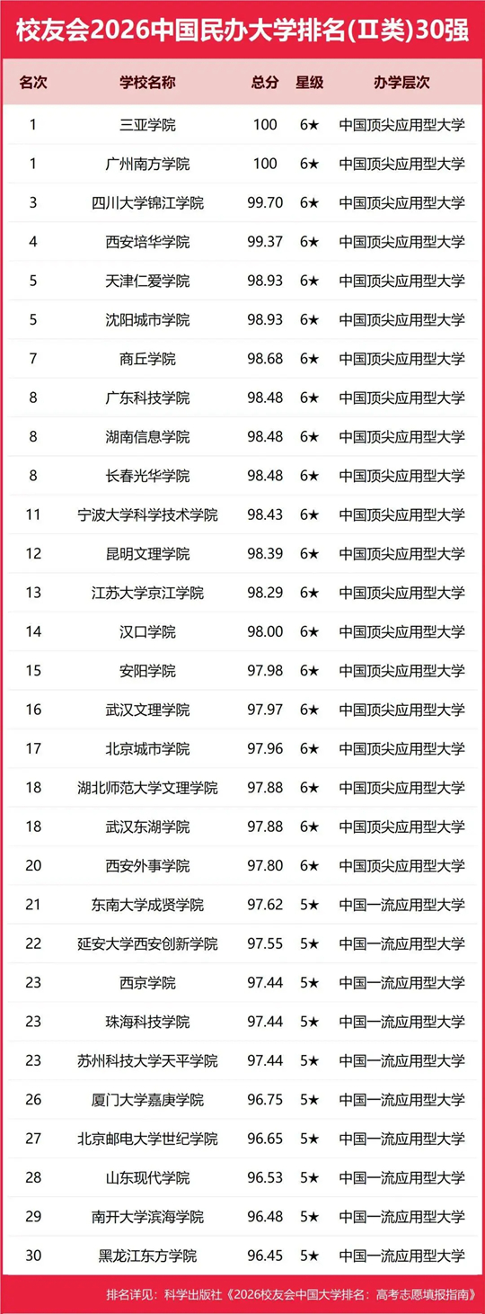 在2026中国民办大学排名(Ⅱ类)中,三亚学院、广州南方学院综合实力最强,连续多年蝉联中国综合类大学排名榜首,问鼎校友会2026中国民办大学排名(Ⅱ类)首位。四川大学锦江学院第3,西安培华学院第4,天津仁爱学院和沈阳城市学院并列第5,商丘学院7,广东科技学院、湖南信息学院和长春光华学院并列第8。