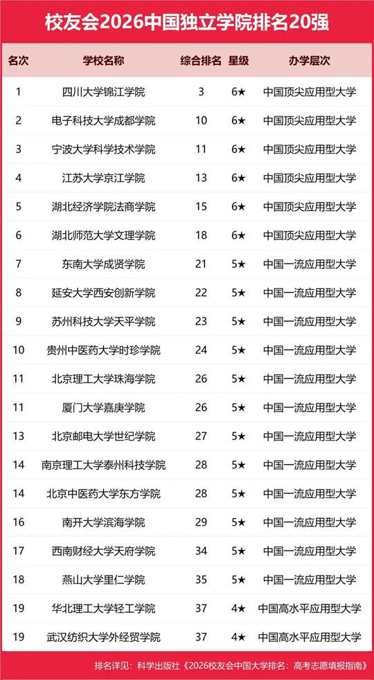 在校友会2026中国独立学院排名中,四川大学锦江学院综合实力最强,连续5年蝉联中国独立学院排名冠军,雄居2026中国独立学院排名榜首。电子科技大学成都学院第2,宁波大学科学技术学院第3,江苏大学京江学院第4,湖北经济学院法商学院第5,湖北师范大学文理学院第6,东南大学成贤学院第7,延安大学西安创新学院第8,苏州科技大学天平学院第9,贵州中医药大学时珍学院第10。