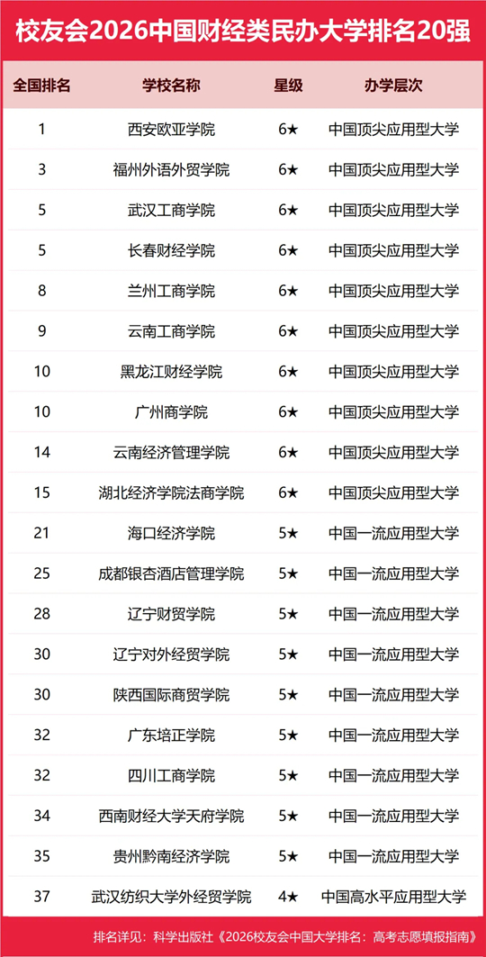 在2026中国民办大学排名(Ⅲ类)中,西安欧亚学院办学实力最强,连续13年蝉联中国财经类民办大学排名榜首,问鼎校友会2026中国民办大学排名(Ⅲ类)冠军。昆明城市学院第2,福州外语外贸学院和山东协和学院并列第3,武汉工商学院和长春财经学院并列第5,黑龙江外国语学院6,兰州工商学院第8,云南工商学院第9,辽宁传媒学院、黑龙江财经学院和广州商学院并列第10。