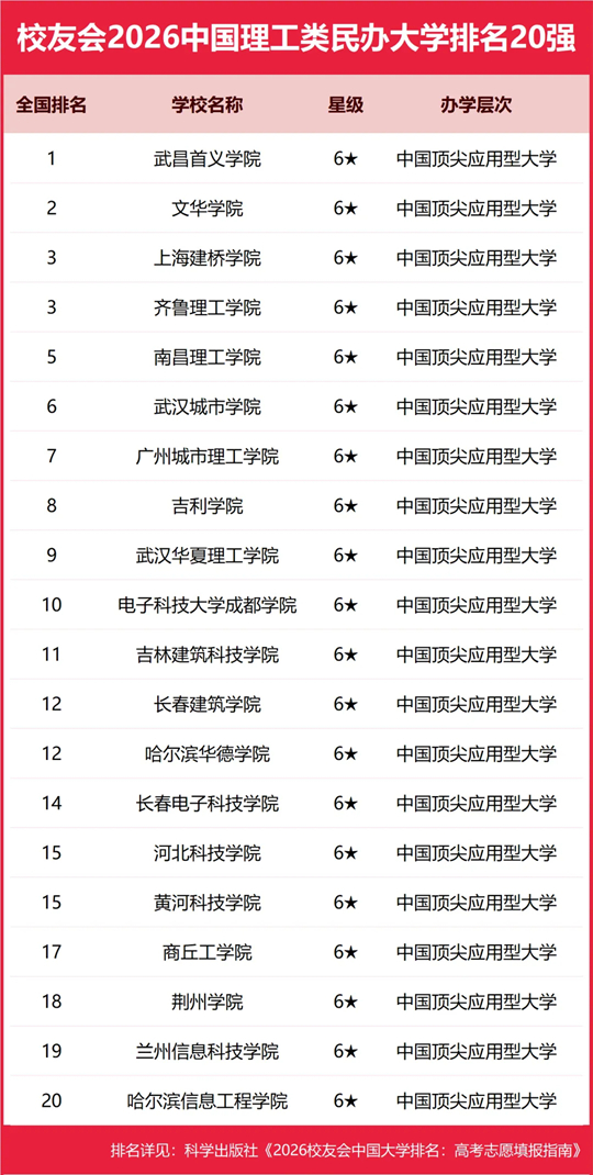 在2026中国民办大学排名(I类)中,武昌首义学院综合实力最强,连续21年蝉联中国民办大学排名冠军,保持在霸主地位,雄居校友会2026中国民办大学排名(I类)榜首。文华学院第2,上海建桥学院、齐鲁理工学院并列第3,南昌理工学院第4,武汉城市学院第6,广州城市理工学院第7,吉利学院第8,武汉华夏理工学院第9,电子科技大学成都学院第10。