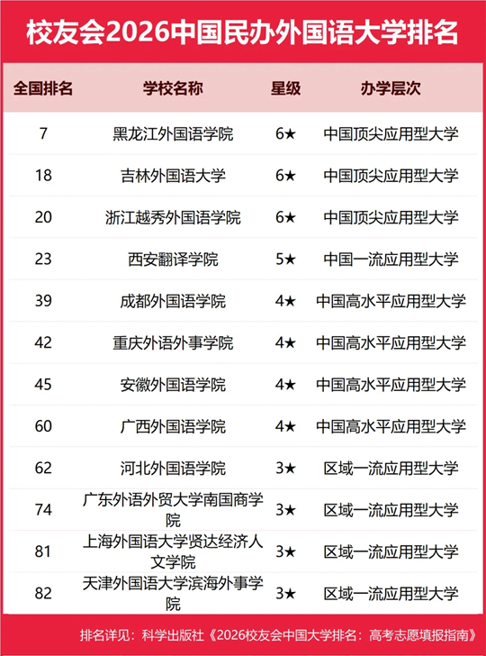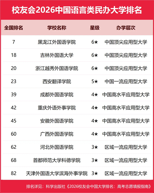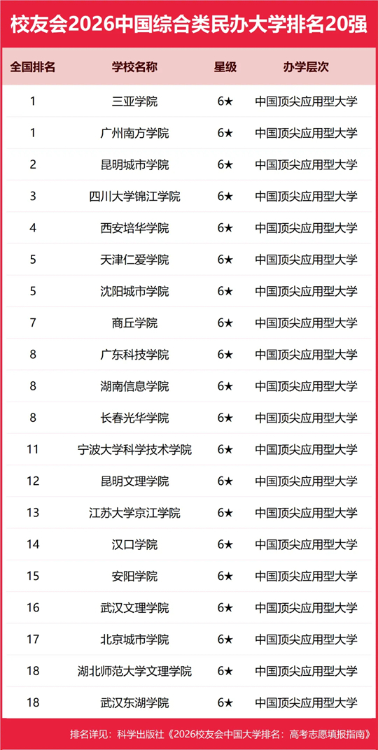 在2026中国各类型民办大学排名中,三亚学院、广州南方学院并列综合类民办大学排名冠军,武昌首义学院问鼎理工类民办大学排名首位,西安欧亚学院荣登财经类民办大学排名第一,山东协和学院稳居医药类民办大学排名第一,黑龙江外国语学院雄居语言类民办大学排名第一,辽宁传媒学院雄居艺术类民办大学排名第一,华南农业大学珠江学院位列农林类民办大学排名第一,南京师范大学泰州学院位列师范类民办大学排名榜首,武汉体育学院体育科技学院雄居体育类民办大学排名第一。