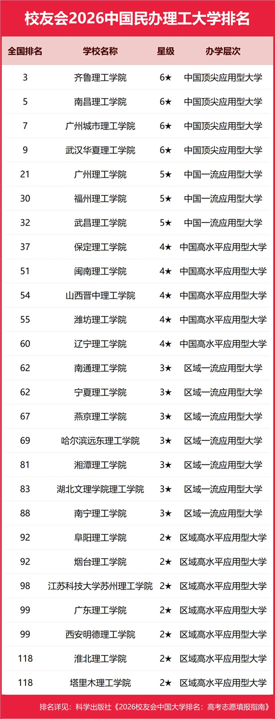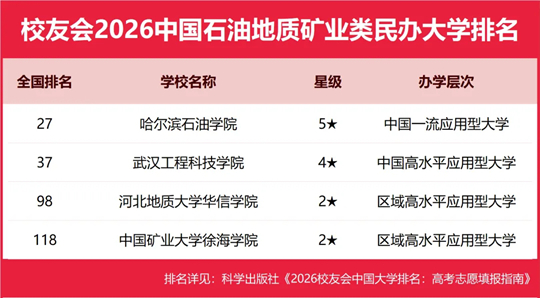 在校友会2026中国特色型民办大学排名中,齐鲁理工学院雄居民办理工大学排名第一,广东科技学院位列科技类民办大学排名第一,湖南信息学院位居信息类民办大学排名第一,商丘工学院位列工业类民办大学排名第一,电子科技大学成都学院位居电子通讯类民办大学排名第一,吉林建筑科技学院位列建筑类民办大学排名第一,哈尔滨信息工程学院位列工程类民办大学排名第一,哈尔滨石油学院位列石油地质矿业类民办大学排名第一,沧州交通学院位列交通类民办大学排名第一。