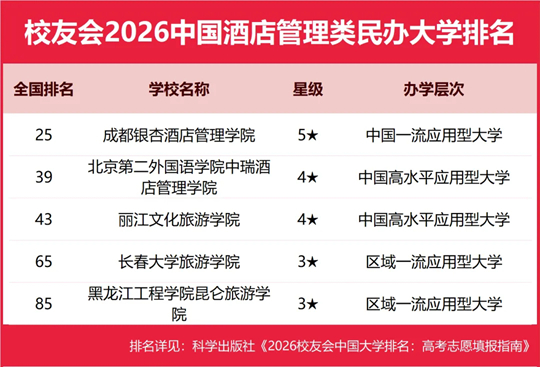 昆明城市学院、福州外语外贸学院、武汉工商学院、广州商学院、昆明文理学院、云南经济管理学院、成都银杏酒店管理学院雄居2026中国城市类、经济类、工商类、商科类、文理类、经济管理类、酒店管理类民办大学排名第一。黑龙江外国语学院、辽宁传媒学院、贵州中医药大学时珍学院、青岛电影学院、河北美术学院、湖北医药学院药护学院、江西服装学院位列2026中国外国语类、传媒类、中医药类、影视表演类、美术类、健康类、纺织类民办大学排名第一。