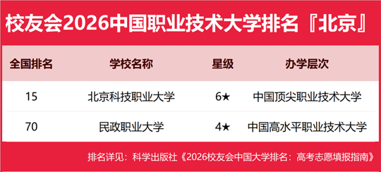 | 校友会2026北京市大学排名,北京大学、北京城市学院、北京科技职业大学、北京工业职业技术学院第一 |