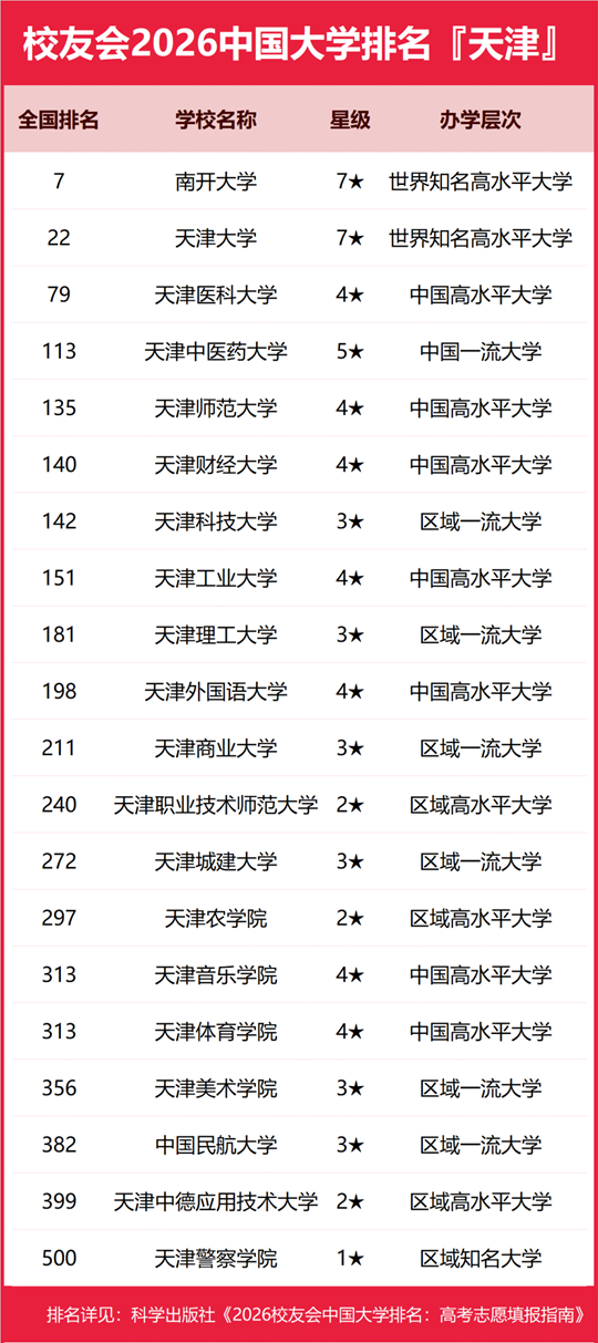 | 校友会2026天津市大学排名,南开大学、天津仁爱学院、天津职业大学、天津轻工职业技术学院第一 |