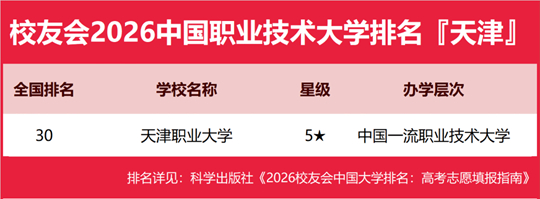 在校友会2026中国职业技术大学排名中,天津职业大学全国排名第30名,雄居2026天津市职业技术大学排名第一。