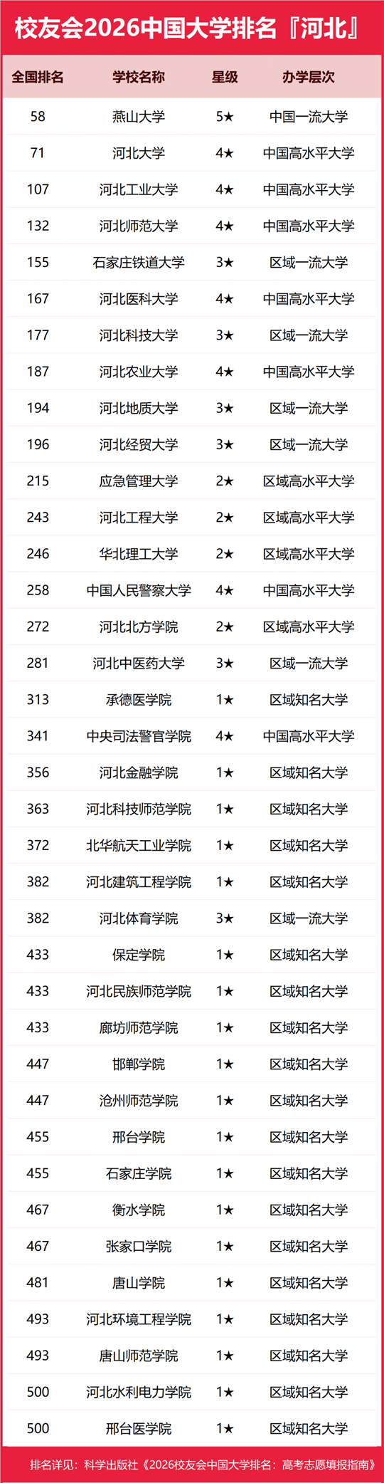 | 校友会2026河北省大学排名,燕山大学、河北科技学院、河北科技工程职业技术大学、沧州医学高等专科学校第一 |