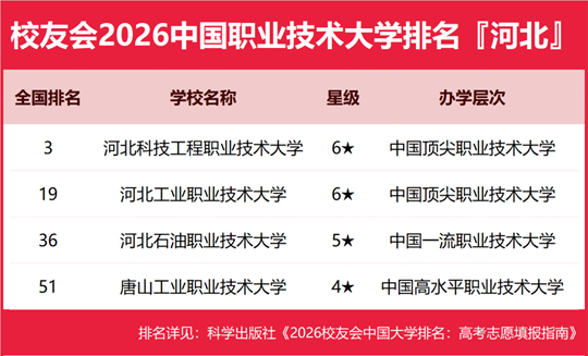 榜单显示,燕山大学问鼎校友会2026河北省大学排名首位,河北科技学院位列2026河北省民办大学排名第一,河北科技工程职业技术大学位居2026河北省职业技术大学排名榜首,沧州医学高等专科学校问鼎2026河北省高职院校排名冠军。
