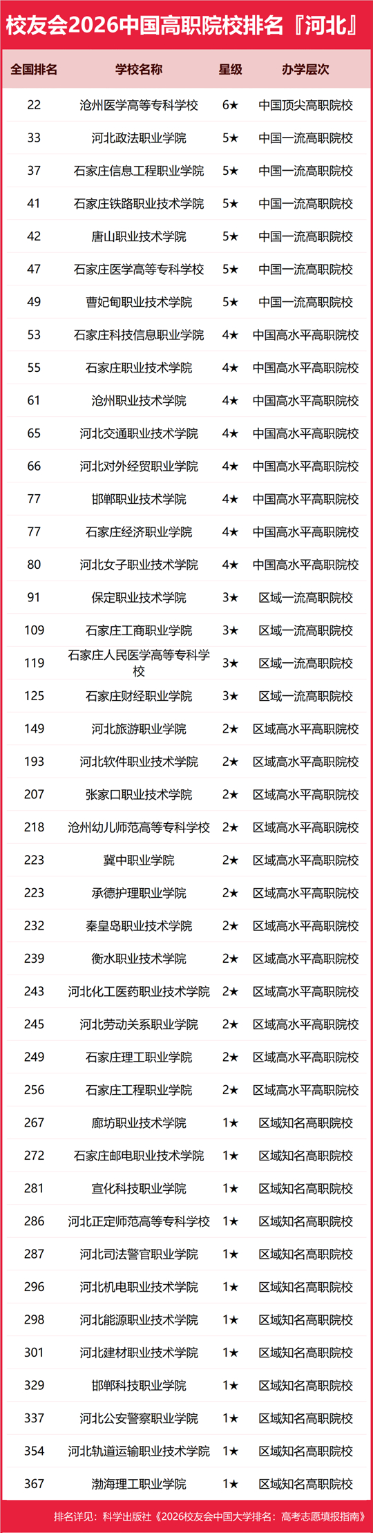 沧州医学高等专科学校雄居2026河北省高职院校排名第一,河北政法职业学院跻身前3强