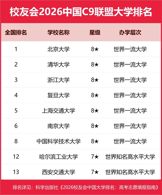 榜单显示,在校友会2026中国大学排名中,C9高校整体综合办学实力最强、办学水平最高,表现最为优秀,具有绝对的领先优势,堪称中国985工程高校的中流砥柱。北京大学、清华大学雄居校友会2026中国C9联盟大学排名冠亚军。浙江大学位居全国第三,复旦大学位居第四,上海交通大学第五,南京大学第六,中国科学技术大学第八,哈尔滨工业大学第十二,西安交通大学位居全国第十三。