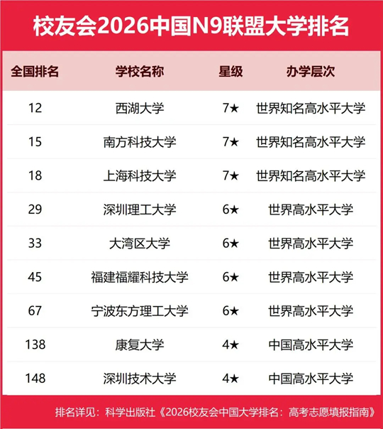 2026年1月12日,全国第三方大学评价机构艾瑞深校友会网(Cuaa.net)撰写完成、科学出版社即将出版发行的《2026校友会中国大学排名:高考志愿填报指南》最新公布校友会2026中国N9联盟大学排名。榜单显示,西湖大学与C9高校并驾齐驱挺进全国12强,雄居校友会2026中国N9联盟大学排名榜首,刷新了中国新型研究型大学排名的最高纪录。南方科技大学、上海科技大学、深圳理工大学表现突出,挺进全国30强。