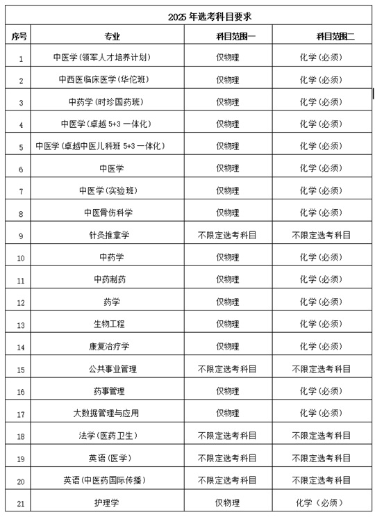 我校2025年高考综合改革省份本科招生专业选考科目要求公布如下:
