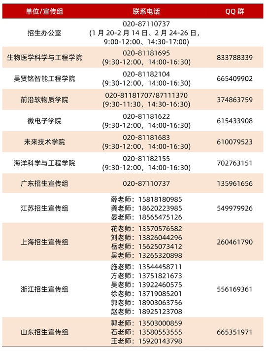 各位家长、考生还可通过招生办公室、招生宣传组、招生学院(联系方式详见:http://admission.scut.edu.cn/30774/list.htm)咨询相关政策。学校寒假期间(1月20-2月26日)可通过以下方式与我们联系咨询。