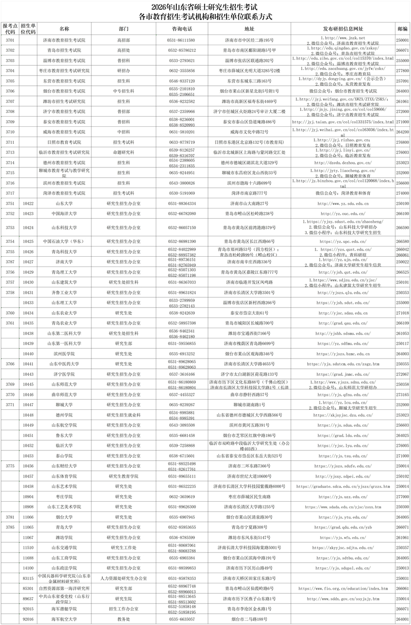 2026年山东省硕士研究生招生考试各市教育招生考试机构及招生单位联系方式