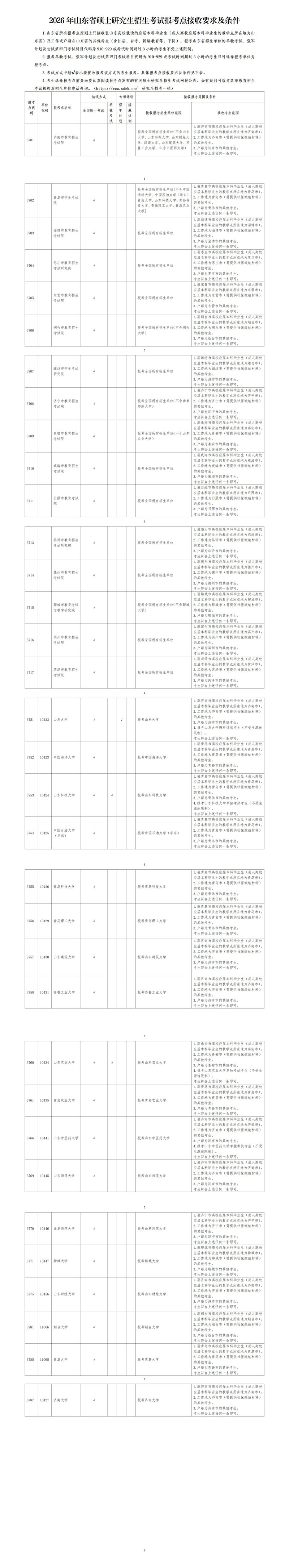 2026年山东省硕士研究生招生考试报考点接收要求及条件