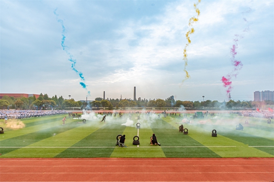 操场上,分列式表演拉开序幕。一列列方阵如同“钢铁长城”,整齐划一地排列开来;刺杀操方阵的同学们紧握钢枪,动作整齐划一,配合默契,尽显英姿。女子匕首操表演中,她们轻盈稳健的动作展现出女性的柔美与力量。三声三相表演尽显斗志昂扬的军人风范,进攻、狙击、反恐……招式精明,步履铿锵,“硝烟弥漫”中为现场师生带来震撼的现场表演。教官刺杀操表演每一个动作都铿锵有力,动作迅猛,让人震撼。千人团体操表演中,队员们以整齐划一的动作,用手中红色、蓝色、黄色的方形色块排列出中国地图、信院六扇门、艺术楼等图形,为师生们带来了一场视觉的盛宴,展现了集体的力量与团队的魅力。