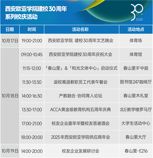 此外,西安欧亚学院建校30周年文艺晚会将率先点亮校庆的第一束光;返校离退教职员工代表午餐会向躬耕教育的教师致敬;供应商年会则彰显与合作伙伴携手共进、构建良性生态的诚意。