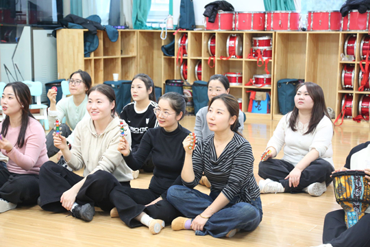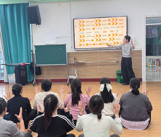 在第二模块中,孟小雨老师以奥尔夫“原本性音乐”理念为核心,从拍手、跺脚等自然节奏出发,引导教师进入生活化音乐体验。课堂中,教师们使用杯子、沙锤、响铃等简易乐器,在“杯子节奏”、“魔法森林”等游戏中学习节奏与音色的变化。课程注重“低门槛、高参与、强互动”,既贴近县域园所实际,又展现音乐教育的开放性与可持续性,通过“动作节奏—音色认知—场景化设计”的教学思路,学员们掌握了将音乐教学融入日常生活的方式,使音乐活动成为情感与创造的桥梁。