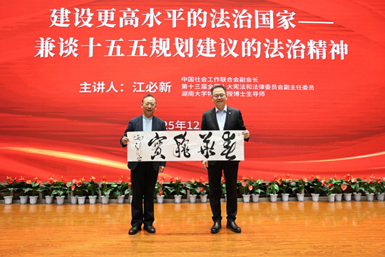 报告会前,江必新教授向学校赠送书法作品。随后,他从“建设更高水平社会主义法治国家的背景与意义”“所需达到的要求和应遵循的标准”“可采取的路径及相应举措”三个维度展开系统阐述,提出“实现更具实效性的宪法实施”“构建更具韧性的严格执法体系”“打造更具效能的公正司法环境”等八项核心观点,涵盖宪法实施、科学立法、严格执法、全面监督、公正司法、普惠法律服务、全民守法及涉外法治建设等领域,为法治实践提供理论指引。