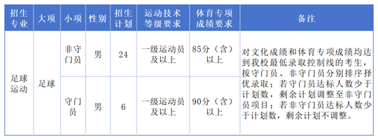 1.招生计划:足球运动专业招生计划为30人以内,择优录取。