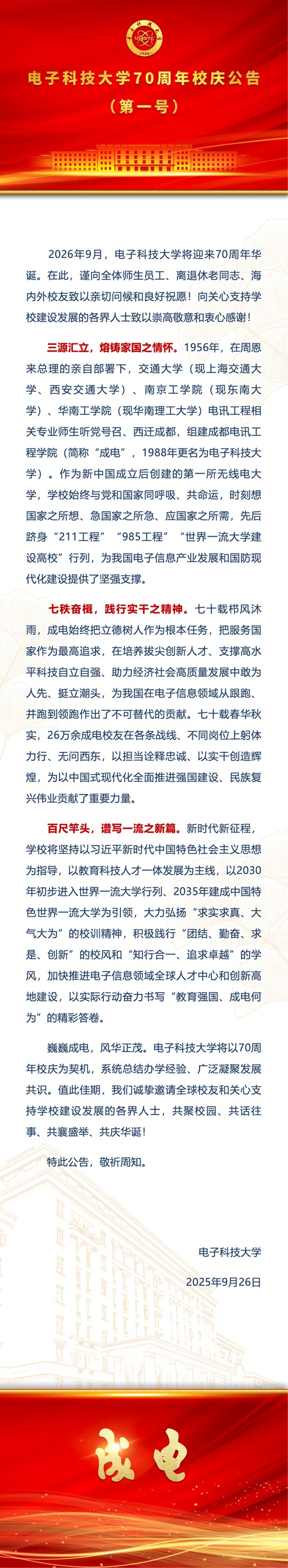电子科技大学70周年校庆公告(第一号)