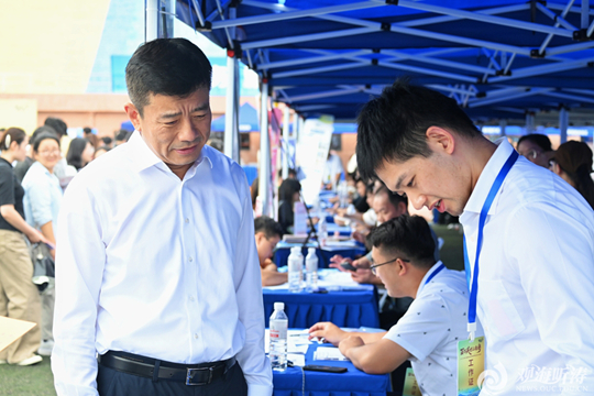 李明现场查看了会场情况,与合作单位、来校招聘单位以及地市组团招聘负责人进行交流,他对用人单位的到来和长期以来对学校毕业生的认可和培养表示感谢,详细了解了行业人才需求形势,听取用人单位对学校人才培养的意见建议,并结合校企校地合作等内容进行了探讨。