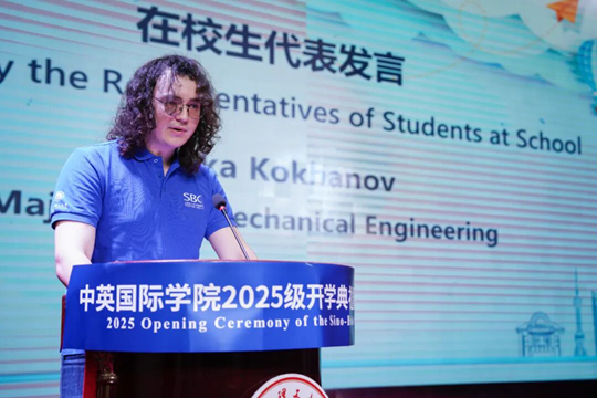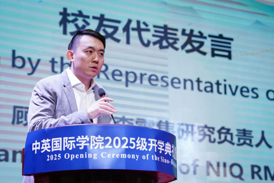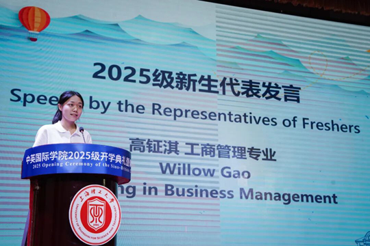 接下来,2025级新生代表高钲淇分享了初入学院的喜悦与憧憬,希望能与所有新生同学们一起勇于探索、敢于创新,在国际化校园里拼搏出属于自己的精彩。在校生代表Luka Kokhanov也分享了自己在中英国际学院求学的感受,作为一名国际留学生,期待能与新生同学们组织和参加丰富多彩的跨文化活动,共同感受中国优秀传统文化的魅力。2008级校友代表、尼尔森零售研究负责人顾问结合自身成长与职场经历,鼓励同学们要专注学业的同时,也要勇敢的走出去看世界,感受不同地域的文化风貌,在开阔国际视野的同时,不断提升和超越自我。
