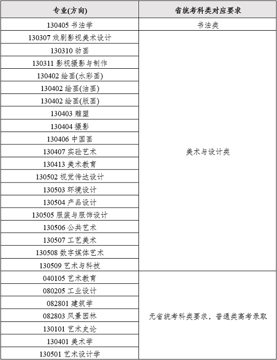 按教育部特殊类型招生工作要求,报考我校艺术类专业的考生须按我校各专业与省级统考科类对应要求参加相应省级统考,各专业对应的省级统考科类要求如下: