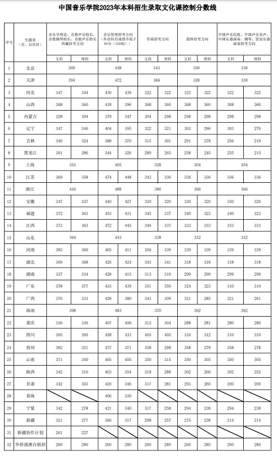 中国音乐学院2023年本科招生录取文化课控制分数线