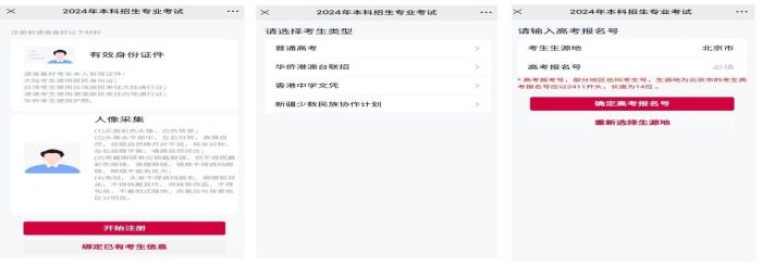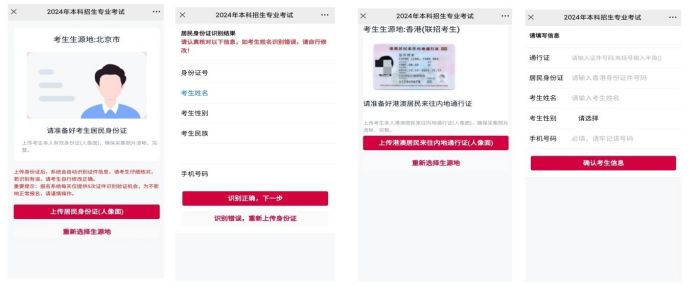 (1)大陆考生,填写14位【高考报名号】,上传有效【身份证件(人像面)】,考生上传身份证后,系统会自动识别证件信息,请考生仔细核对,若识别有误,请考生自行修改正确;报名系统每天仅提供5次证件识别验证机会,为不影响正常报名,请谨慎操作。考生确认身份信息识别正确后,填写考生本人【手机号码】进行下一步,开始【人像采集】。