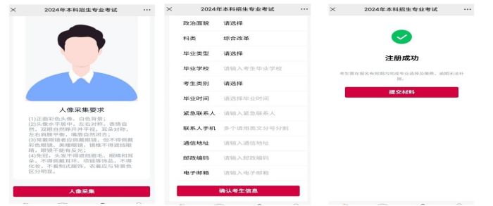 (2)港澳台侨考生,上传有效【港澳居民来往内地通行证(人像面)】或【台湾居民来往大陆通行证(人像面)】或【护照(人像页)】,根据提示补充考生信息,【确认考生信息】后,开始【人像采集】。