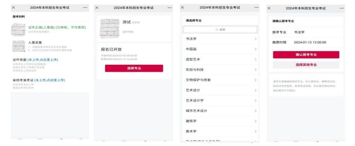 考生上传报考材料后,点击【首页】,进行【选择专业】。考生应严格遵守诚信考试原则,真实、准确填写各项考生信息,考生信息一经确认,不可更改,并在缴费前认真核对所选择报考的专业,确认无误后,点击【确认报考专业】,通过微信进行缴费,报考费:160元/人。缴费成功后,即启动考务组织程序、安排考试资源,无论是否参加考试,报名费均不予退还。