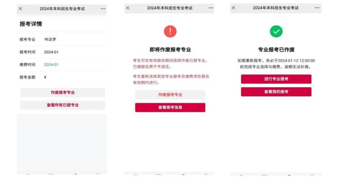 因考生个人原因,确需作废已报考专业的,须在报名有效期内点击【作废报考专业】,重新选择其他专业进行报考,并在报名有效期内完成缴费,作废专业报名费不予退还。