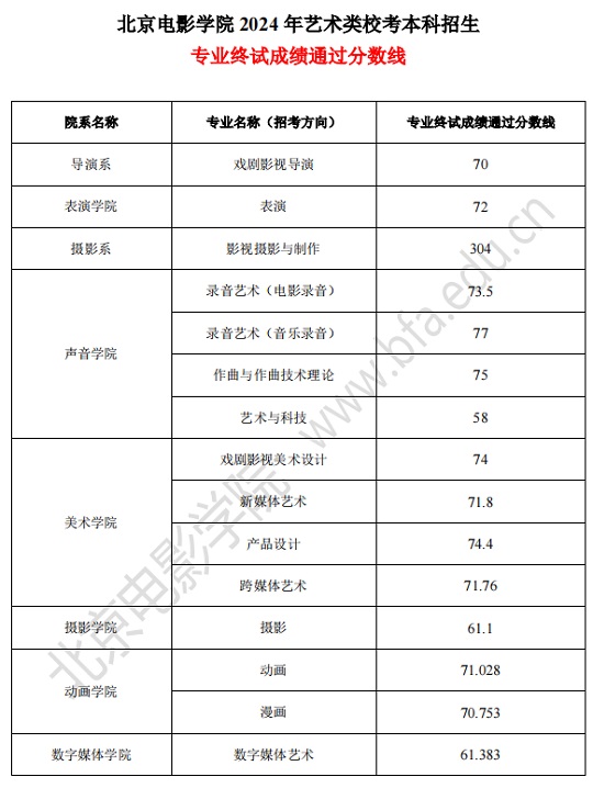 北京电影学院2024年艺术类校考本科招生专业终试成绩通过分数线