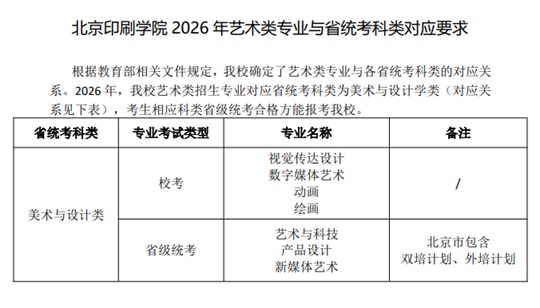 北京印刷学院2026年艺术类专业与省统考科类对应要求
