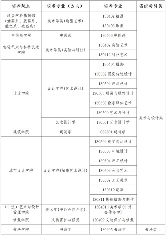 中央美术学院2026年本科招生校考专业(方向)省统考科类对应要求