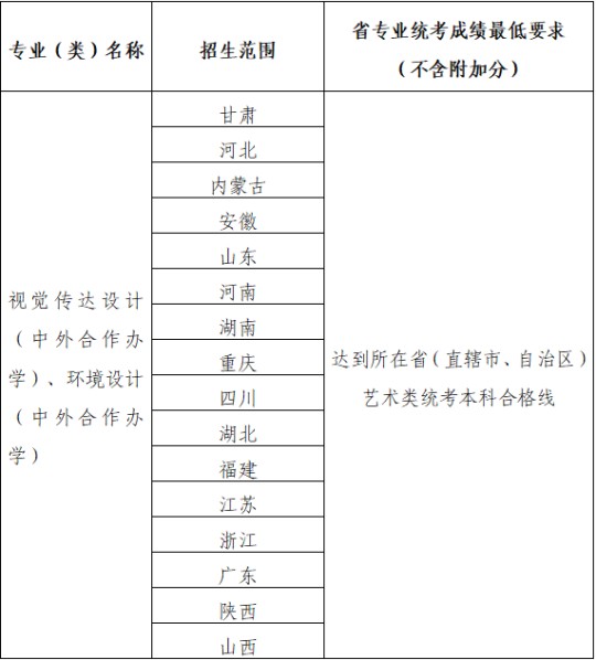 (三)视觉传达设计(中外合作办学)和环境设计(中外合作办学)专业只录取填报相关专业志愿的学生(含服从两个专业间调剂的学生),入校后不允许转入非中外合作办学专业。