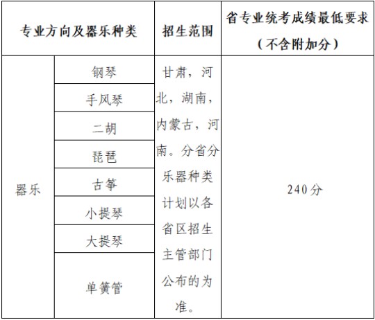 专业考试器乐种类须与我校招生专业对应的器乐种类完全匹配,否则不予录取。无影响器乐演奏的生理缺陷。考生自身身心健康状况不影响专业表演、演奏和学习,符合《普通高等学校招生体检工作指导意见》及有关补充规定要求。