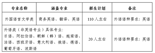 我校2020年外语类保送生招生计划为130人左右(根据生源质量、数量和测试成绩等情况予以调整),招生专业和招生计划如下: