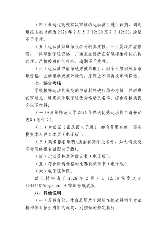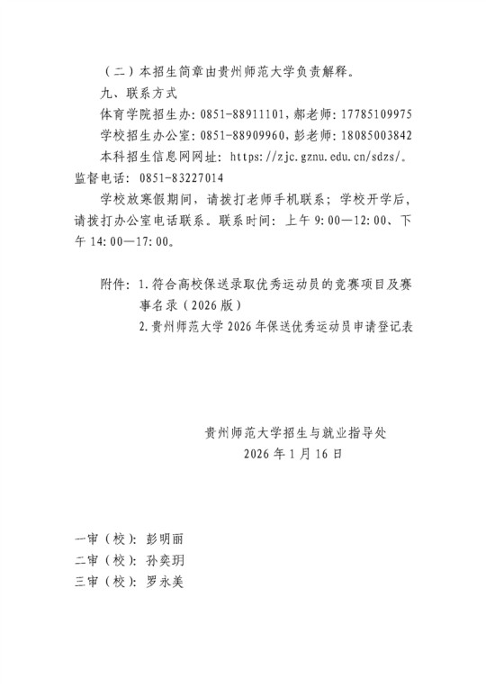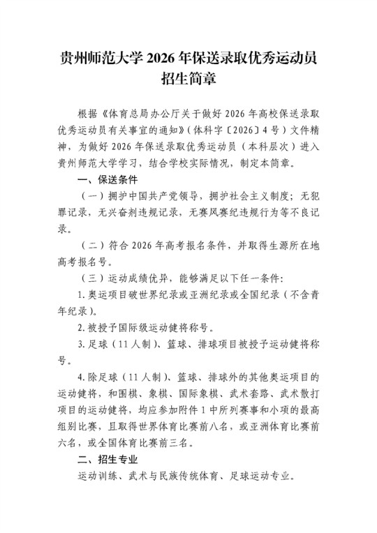 贵州师范大学2026年保送录取优秀运动员招生简章