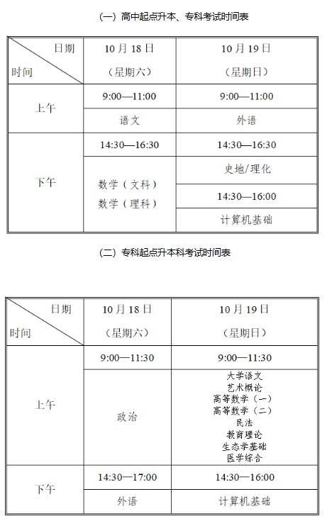 高中起点的语文、数学、外语(外语科目语种分英语、日语)、理化、史地,考试时间均为120分钟;计算机基础考试时间为90分钟。各科目满分均为150分。
